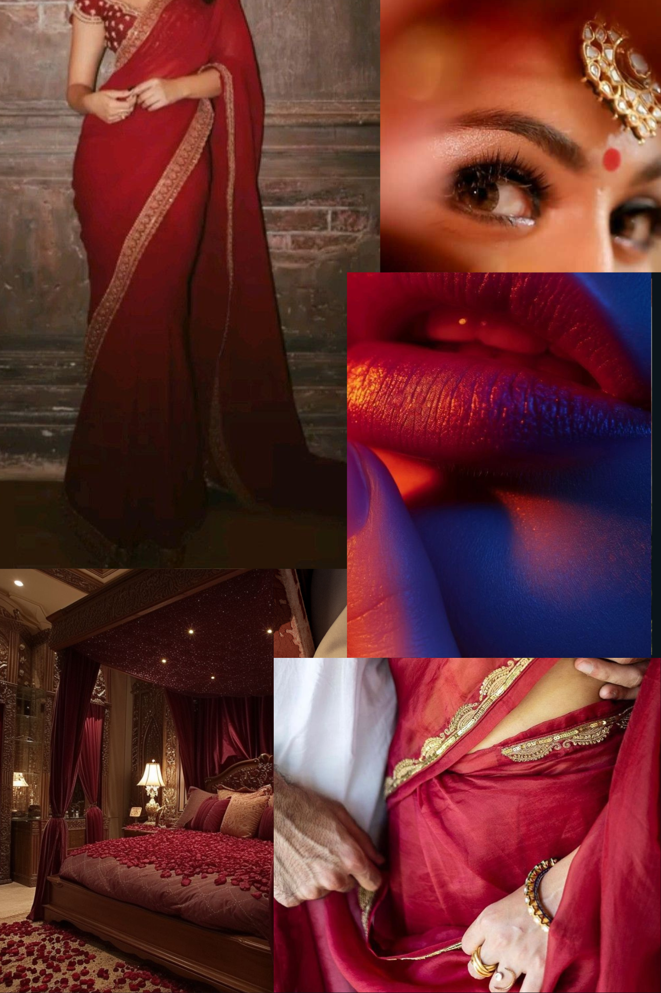 He saw her... she's standing in his room, glowing. Draped in a deep red saree that hugs her curves like it was stitched by desire itself. Her long hair flows down in soft waves, her maang tikka catching the light. Her lips, those familiar, infuriating, plump lips glossed and slightly parted. She looks... like a bride, his bride. For a second he forgot to breathe.
